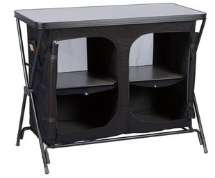 Om ook buiten te kunnen koken maken we een invouwbare buitenkeuken. Na enig zoeken vinden we een campingkast en een gasplaat die we zodanig kunnen samenbouwen dat het nog steeds opvouwbaar is. We gebruiken daarvoor een campingkast van het merk 'Redwood' (eigen merk van De Vrijbuiter) en een kookplaat die we vinden bij Obelink. Voordeel van die laatste is ook een piëzo vonkontsteking waarvoor geen batterij nodig is. De benodigdheden: